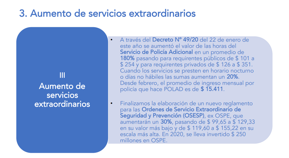El acuerdo, según anunció la Casa Gris, es extensivo a la totalidad del personal, pero priorizará a los grados policiales más bajos y en especial a los empleados que cumplen funciones operativas, es decir, de calle, a los que asignará una suma fija de 7 mil pesos, y una tarjeta alimentaria que alcanzará a 15.800 efectivos. También anunciaron que aumenta un 30 por ciento el valor de las horas extraordinarias.
