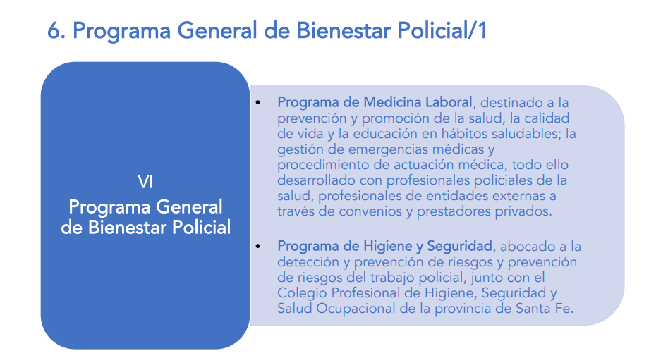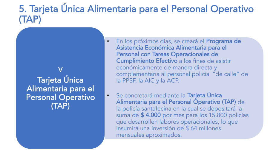 A la vez, la administración provincial extenderá la Tarjeta única alimentaria para el personal operativo (Tap) de la policía santafecina en la cual se depositará la suma de 4 mil pesos por mes para los 15.800 policías que desarrollen labores operacionales, lo que insumirá una inversión de 64 millones mensuales aproximados.