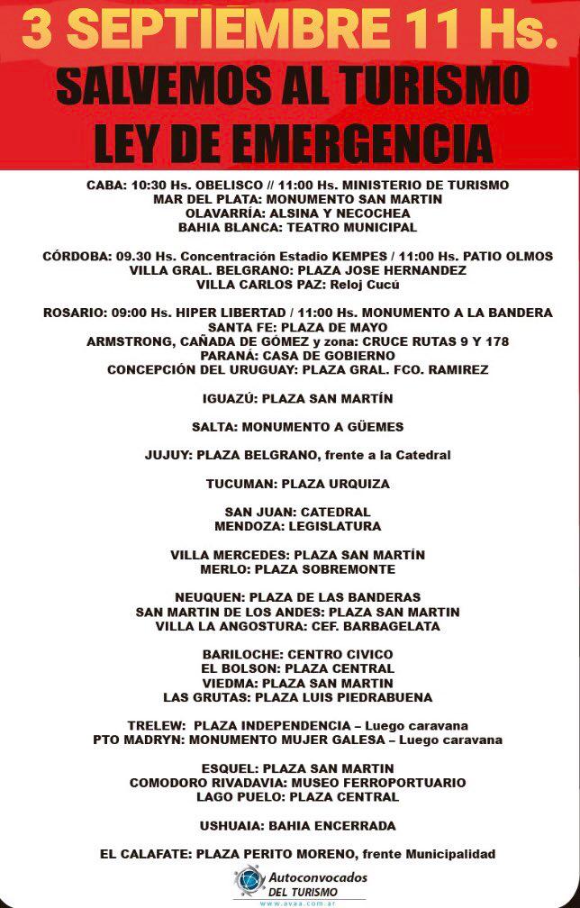 «Salvemos al Turismo” es la consigna plasmada en un comunicado que circula en las redes sociales durante los últimos días y que invita a reclamar el jueves 3 de septiembre en distintos puntos del país, con el objetivo de que se restablezca la actividad y que se sancione en forma urgente la Ley de Sostenimiento y Reactivación.