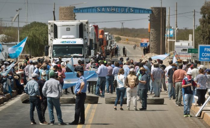 Productores autoconvocados de las provincias de Córdoba, Santa Fe, La Pampa, Mendoza, San Luis y San Juan bloquean todas las rutas de ingreso a la provincia para reclamar un protocolo más flexible para ingresar a la provincia puntana.