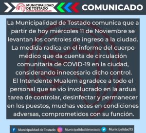 La Municipalidad de Tostado comunica que a partir de hoy miércoles 11 de noviembre se levantan los controles de ingreso a la ciudad.