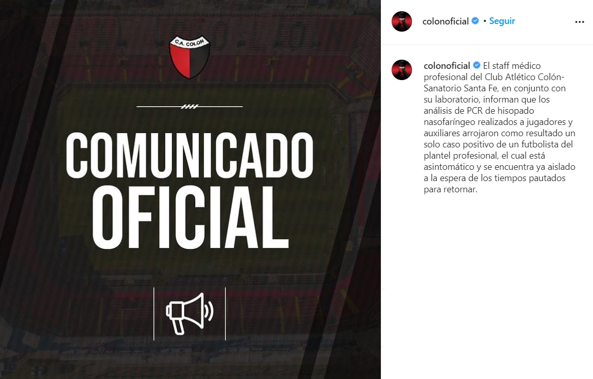 El Club Atlético Colón comunicó que un jugador del plantel dio positivo al test de coronavirus.