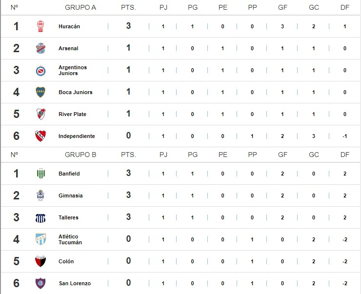 En la zona 2, donde participa Colón, 3 equipos están arriba con 3 unidades: Banfield, Gimnasia y Talleres, mientras que Colón, Atlético Tucumán y San Lorenzo tienen 0.