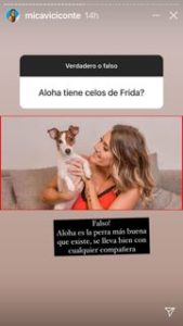Se trata de Frida una hermosa perrita que adoptaron ambos y que ahora es la fiel compañera de Aloha, la otra mascota que tiene la pareja. En su historia Mica la presentó y le preguntaron su su perrita de toda la vida está celosa de su nueva amiguita y la modelo respondió: ¡Falso! loha es la perra más buena que existe, se lleva bien con cualquier compañera.
