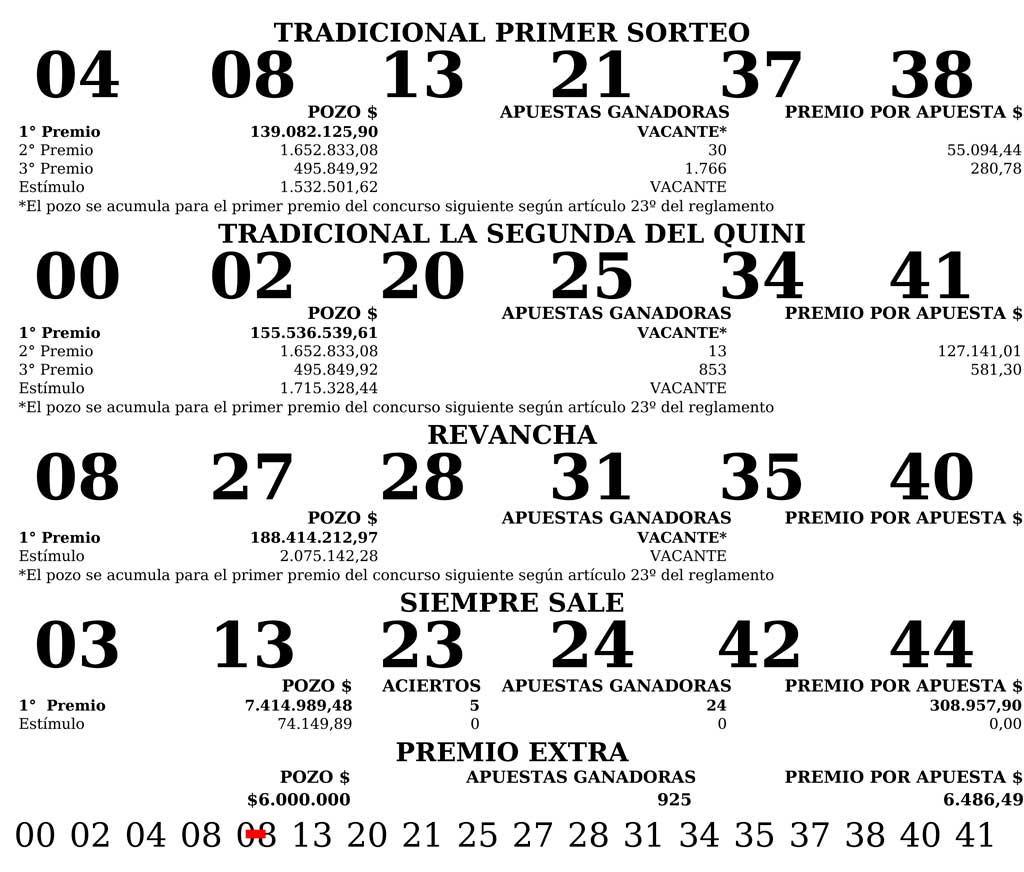 Cabe recordar que el valor de la apuesta Tradicional 1º sorteo y la Segunda: $ 60,00. Con Revancha: $ 85,00. Con Revancha y Siempre Sale: $ 100,0.