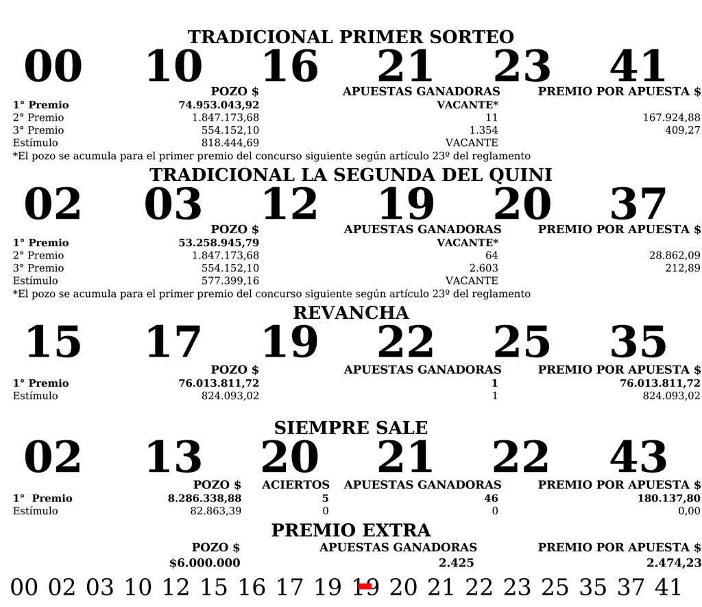 El apostardor se quedó con la categoría «Revancha» y se lleva un premio de $ 76.013.811,72. De esta manera, para el sorteo del próximo miércoles se espera un pozo acumulado de $ 188.000.000.