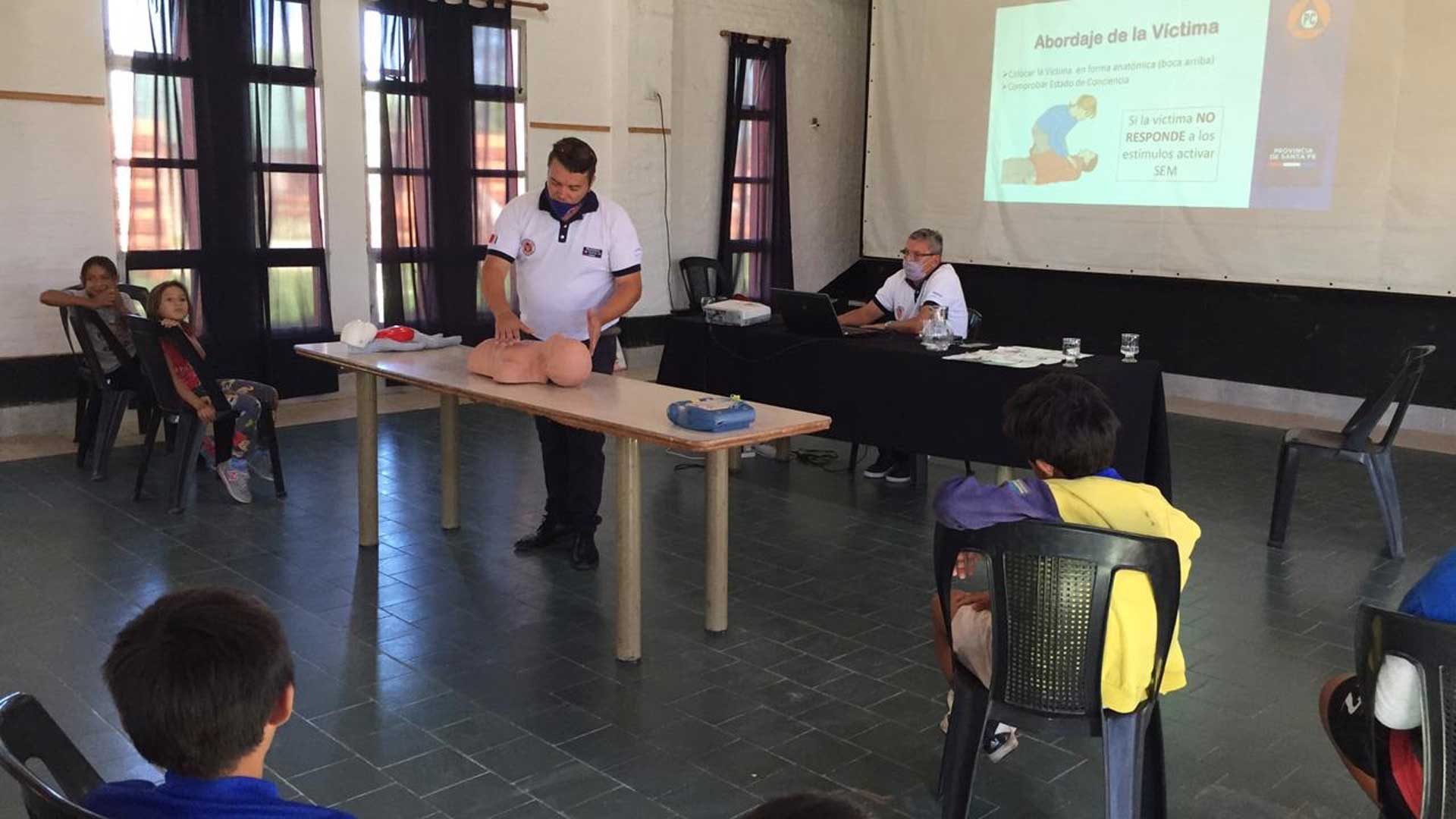 En el marco del programa provincial Verano Activo, este jueves a la mañana en Villa Minetti se realizó una capacitación en RCP y primeros auxilios destinada a alumnas y alumnos de escuelas locales con los que se viene trabajando para recuperar el vínculo pedagógico.