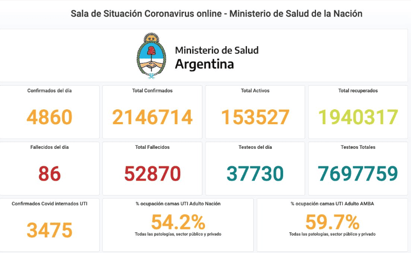 El Ministerio de Salud de la Nación informó que ya son 2.146.714 los infectados desde el inicio de la pandemia y 52.870 personas perdieron la vida.