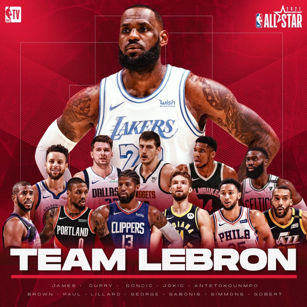 Team LeBron: Giannis Antetokounmpo, Stephen Curry, Luka Doncic, Nikola Jokic, Damian Lillard, Ben Simmons, Chris Paul, Jaylen Brown, Paul George, Domantas Sabonis y Rudy Gobert.