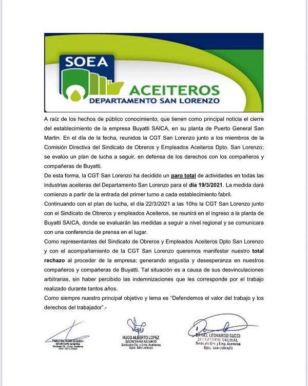 En medio del conflicto por el cierre de Buyatti, el gremio de Aceiteros (SOEA) anunció un paro por 24 horas para el 19 de marzo.