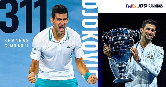 El serbio número uno del mundo, Novak Djokovic, logra este lunes 8 de marzo, sumar 311 semanas como el mejor del ranking ATP y establecer un neuvo récord mundial tras superar al suizo Roger Fededer con 310. El suizo ostentaba este récord desde el 16/07/2012 cuando superó las 286 semanas de Sampras.