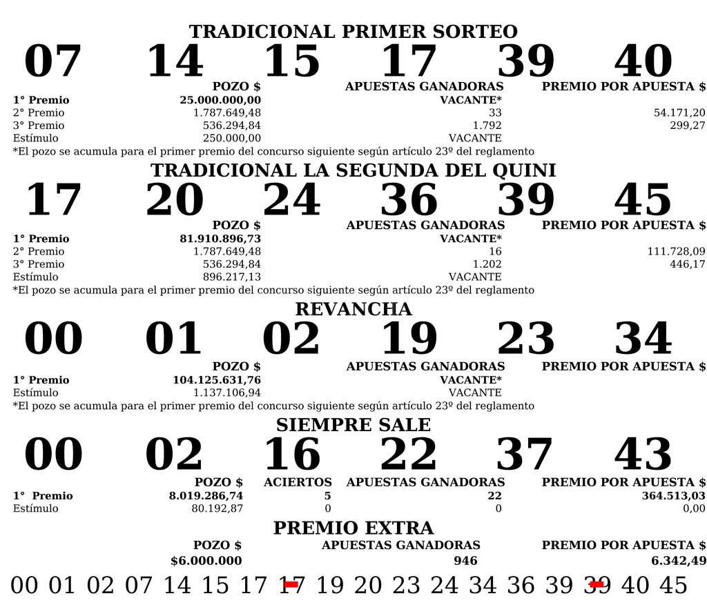 Cabe recordar que el valor de la apuesta Tradicional 1º sorteo y la Segunda es de: $ 60,00. Con Revancha: $ 85,00. Con Revancha y Siempre Sale: $ 100,0.