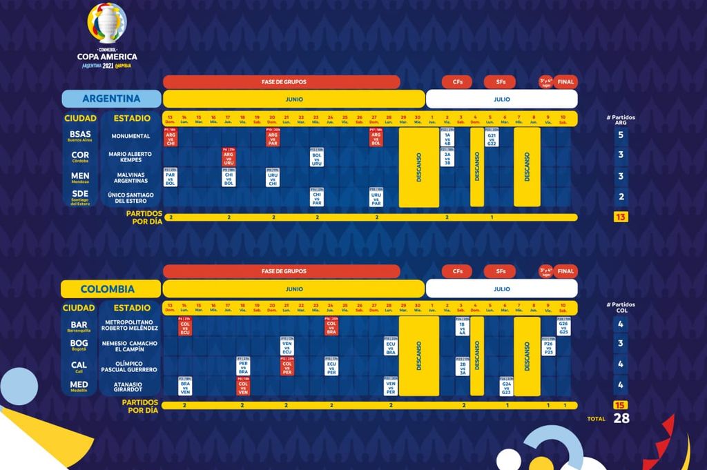 La CONMEBOL dio a conocer el fixture del torneo que será disputado por 10 selecciones en ciudades de Argentina y Colombia, entre el 13 de junio y el 10 de julio.