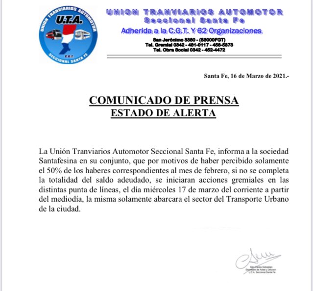 La Unión Tranviarios Automotor emitió un comunicado a través del cual informó que se encuentra en estado de alerta.