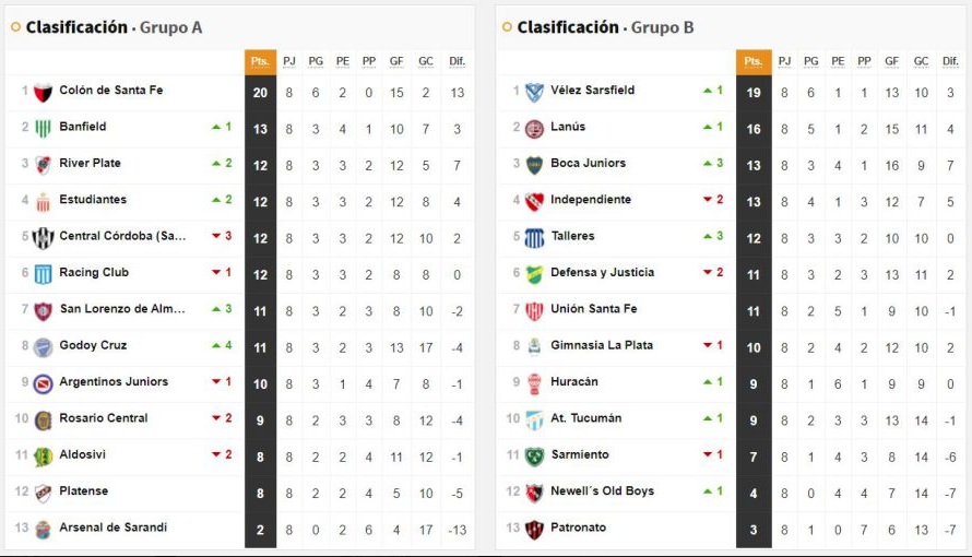 El empate entre Banfield y Estudiantes cerró la octava fecha de la Copa de la Liga Profesional de Fútbol y las tablas de posiciones volvieron a rotar. Colón lidera invicto la Zona A con 20 puntos, producto de seis victorias y dos empates.