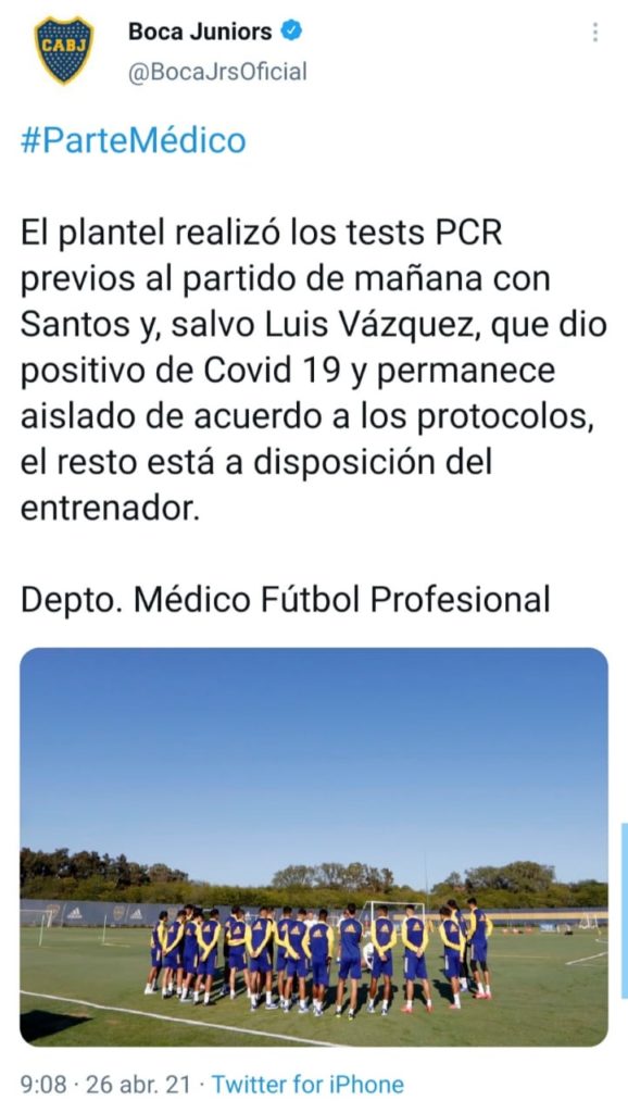 El goleador de la reserva xeneize dio positivo de Covid 19 en la ronda de testeos previa al partido de mañana a las 21:30 en La Bombonera frente al Santos por la segunda fecha del Grupo C de Copa Libertadores. Luis Vázquez fue el único positivo (ya se encuentra aislado en buen estado de salud) y el resto dieron negativo según confirmó Boca en sus redes sociales.
