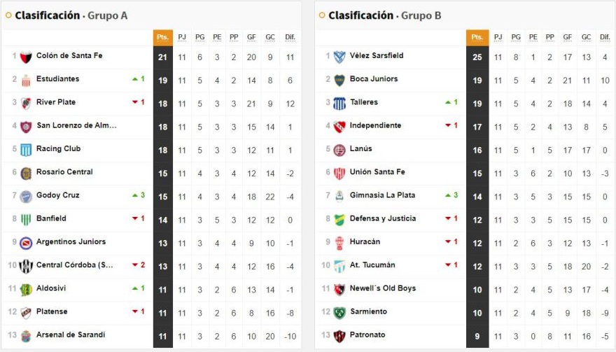 En la Zona A, Colón es el puntero con 21, Estudiantes tiene 19 y con 18 están River, San Lorenzo y Racing. Central y Godoy Cruz tienen 15.