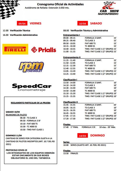 Las 5 categorías tradicionales TC4000 Santafesino, Turismo Santafesino 1800, Turismo Fiat Standard, Fórmula 3 Santafesina y la Fiat 600 comenzarán con la actividad en pista mañana sábado con los primeros entrenamientos y luego las pruebas de clasificación mientras que el domingo por la mañana se disputarán las series y por la tarde, las finales. Tras los anuncios del gobierno nacional con el nuevo DNU por la pandemia de Covid 19, desde el Car Show se recuerda el uso obligatorio de tapaboca y el cumplimiento estricto de los protocolos.