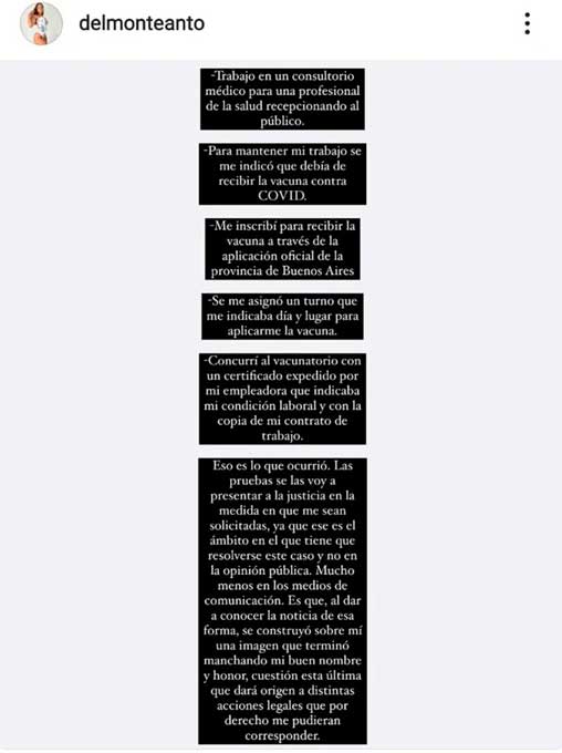 Antonella Delmonte, la modelo de 24 años que se vacunó contra el coronavirus en Merlo sin estar dentro de un grupo de riesgo y fue denunciada por «falsedad ideológica», hizo un descargo en su cuenta de Instagram.