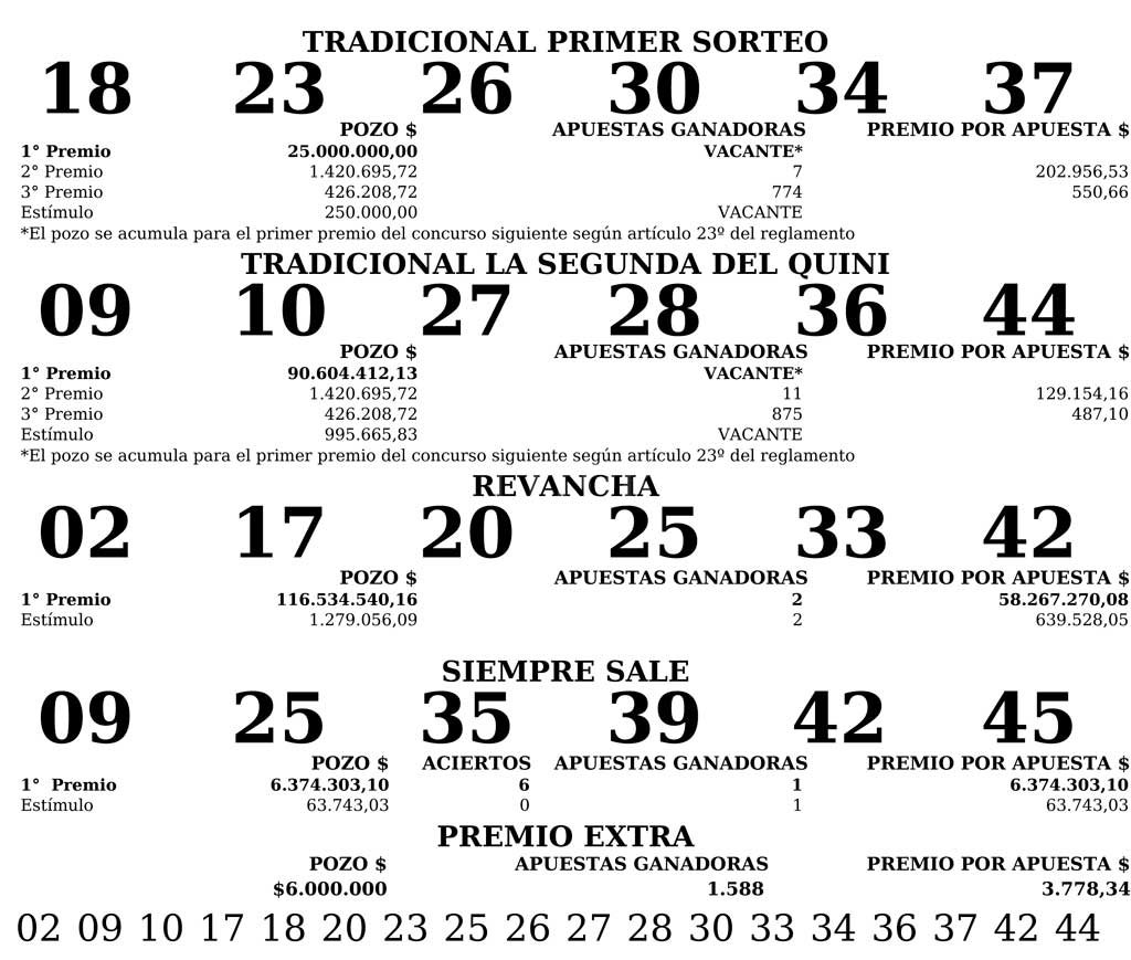 Los apostadores se quedaron con la categoría «Revancha» y cada uno se lleva una suma de $ 58.267.270,08. De esta manera, para el sorteo del próximo domingo se espera un pozo acumulado estimado en $ 176.000.000.