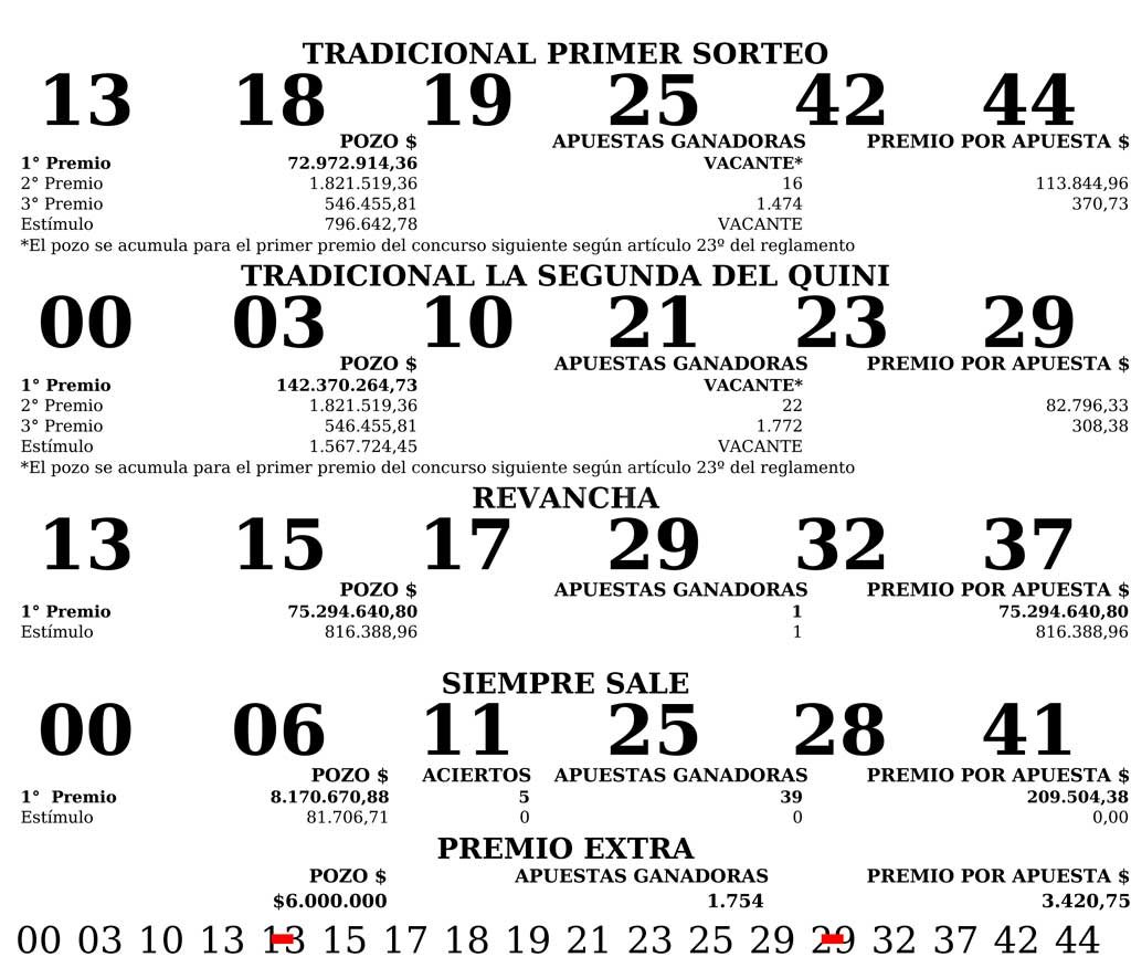 Este domingo por la noche se desarrolló el concurso n° 2850 de Quini 6 y hubo un ganador con seis aciertos. El apostador se quedó con la categoría «Revancha» y se llevó un premio de $ 75.294.640,80.