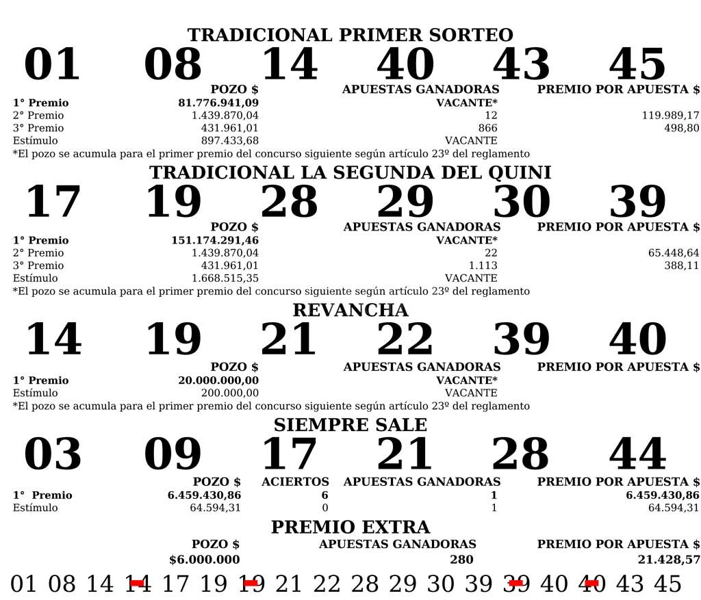 Cabe recordar que el valor de la apuesta Tradicional 1º sorteo y la Segunda es de $ 60,00. Con Revancha: $ 85,00. Con Revancha y Siempre Sale: $ 100,0.