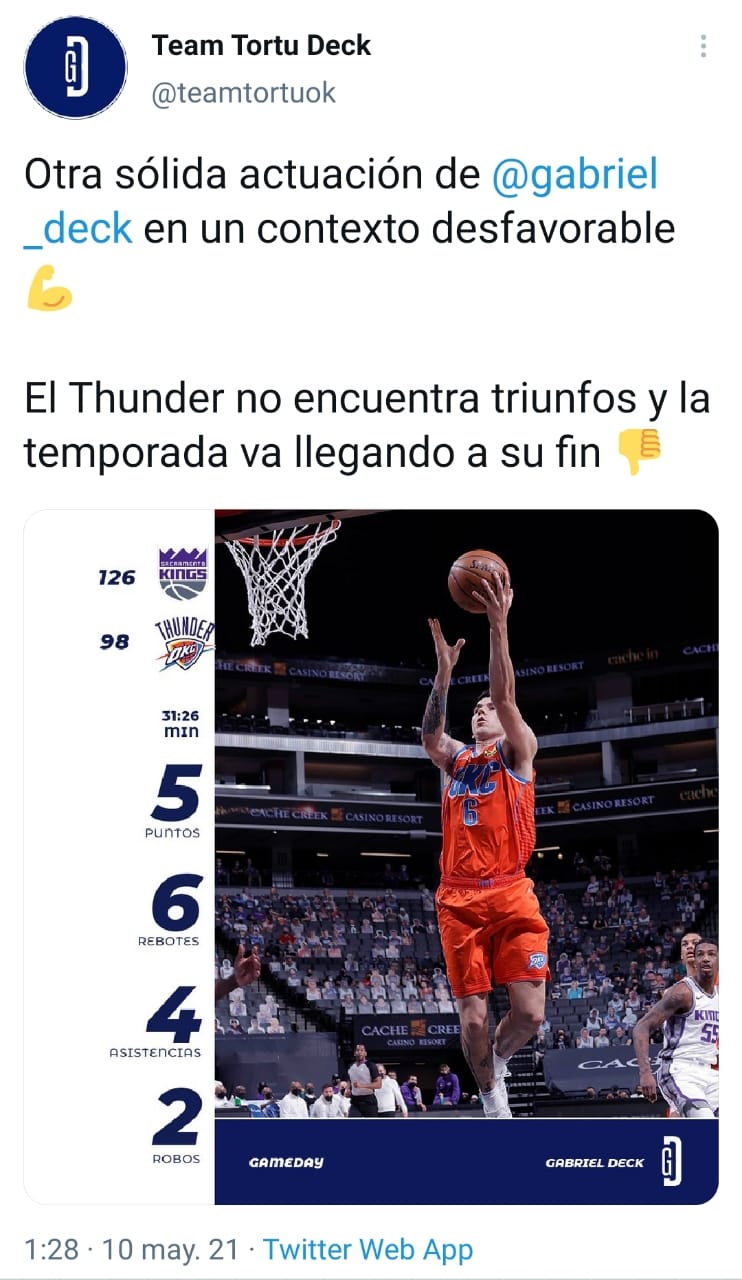 Los Kings derrotaron por 126 a 98 a Oklahoma City Thunder en una nueva jornada de la NBA. Gabriel Deck jugó el séptimo partido en NBA y disputó 31 minutos, su mayor cantidad desde su debut con una planilla de 5 puntos, 6 rebotes, 4 asistencias y 2 robos con 1-8 en tiros de campo (0-3 en triples) y 3-4 en tiros libres, con la intensidad habitual pero sin estar fino en la finalización de las jugadas.