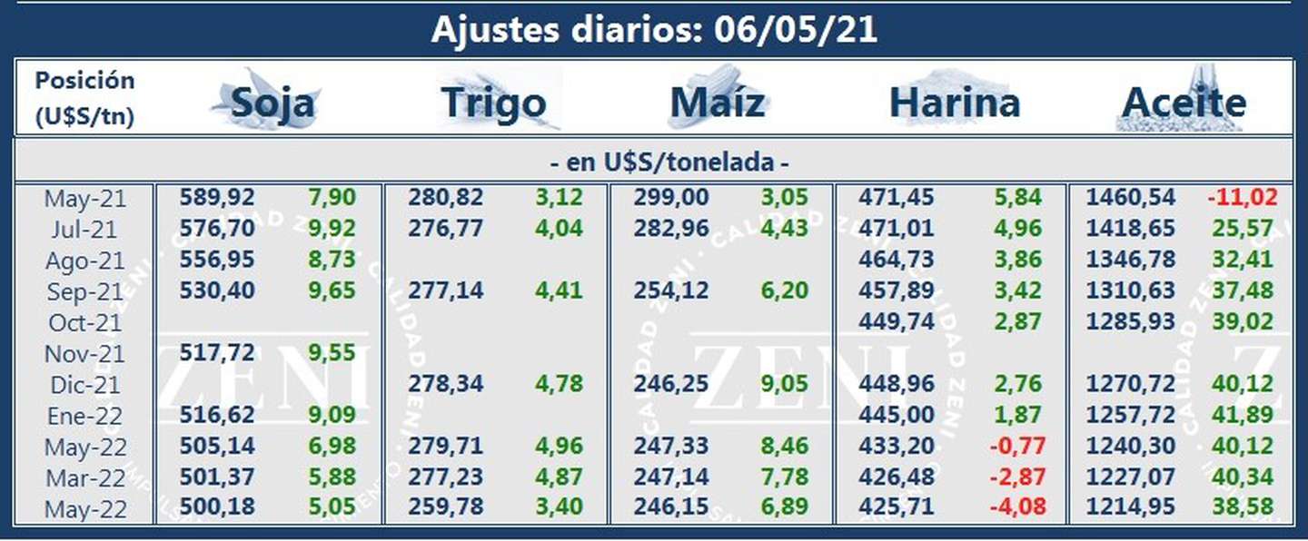 En tanto, desde la corredora Zeni explicaron que durante la jornada, mientras que los contratos Mayo 2021 cotizaron en delivery, la brecha con los contratos de Julio 2021 se redujo a niveles de US$13 por tonelada.