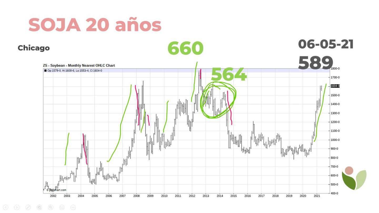 Este jueves, la pizarra de soja en la Argentina alcanzó un pico de US$348 por tonelada, frente a lo cual los especialistas indicaron que si acompaña los valores del Mercado de Chicago como sucedió cuando hubo niveles máximos históricos, una década atrás, se podría volver al techo de US$435 de agosto del 2012. La posición Mayo en nuestro país llegó a los US$350 y en Chicago alcanzó los US$590. “Son valores que no se han visto en la Argentina desde hace muchísimas campañas”, destacó ante TN.com.ar la analista granaria, Paulina Lescano.