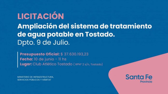 A través de la secretaría de Empresas y Servicios Públicos, dependiente del Ministerio de Infraestructura, Servicios Públicos y Hábitat, se realizará la licitación para la ampliación del sistema de tratamiento de agua de río, en la localidad de Tostado. El acto licitatorio se llevará a cabo el día jueves 10 de junio a las 11 horas en el Club Atlético Tostado, sito en Ruta Provincial Nº 2 s/n de la localidad homónima.