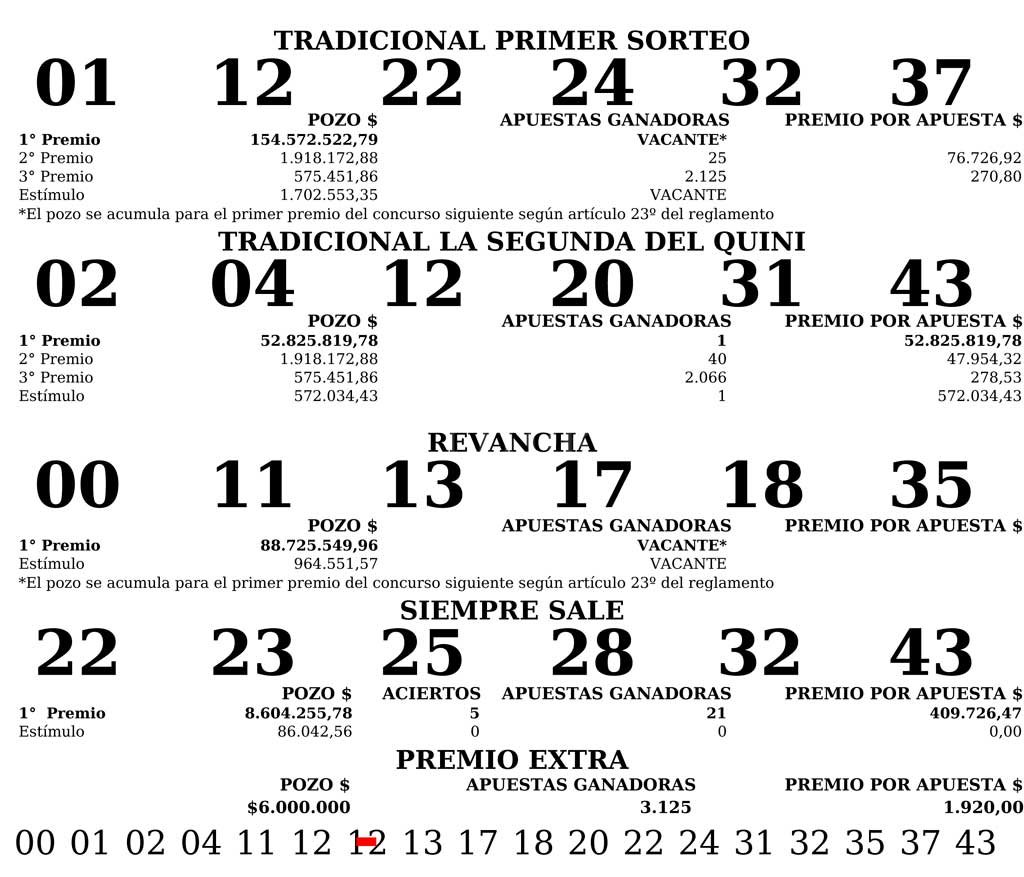 Cabe recordar que el valor de la apuesta Tradicional 1º sorteo y la Segunda es de $ 60,00. Con Revancha: $ 85,00. Con Revancha y Siempre Sale: $ 100,0.