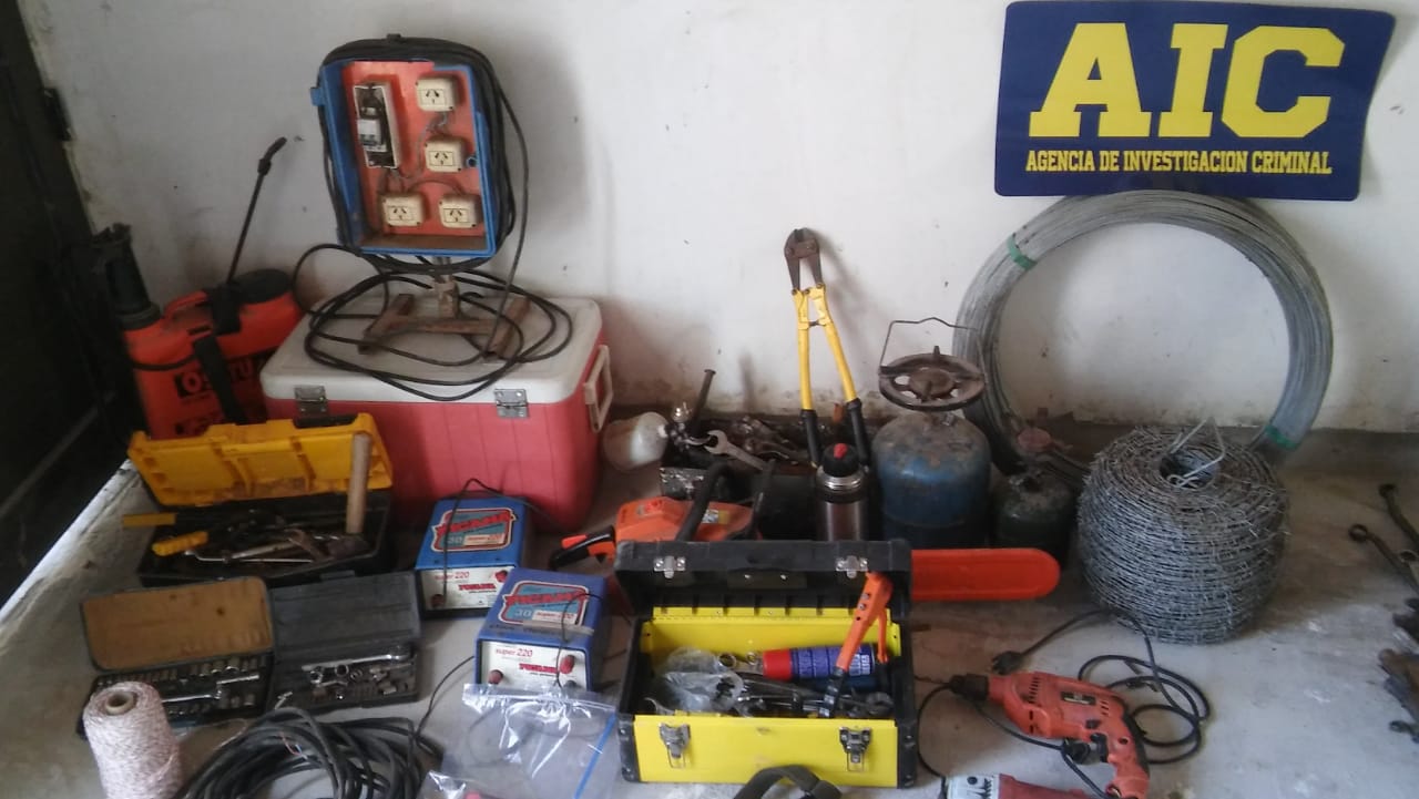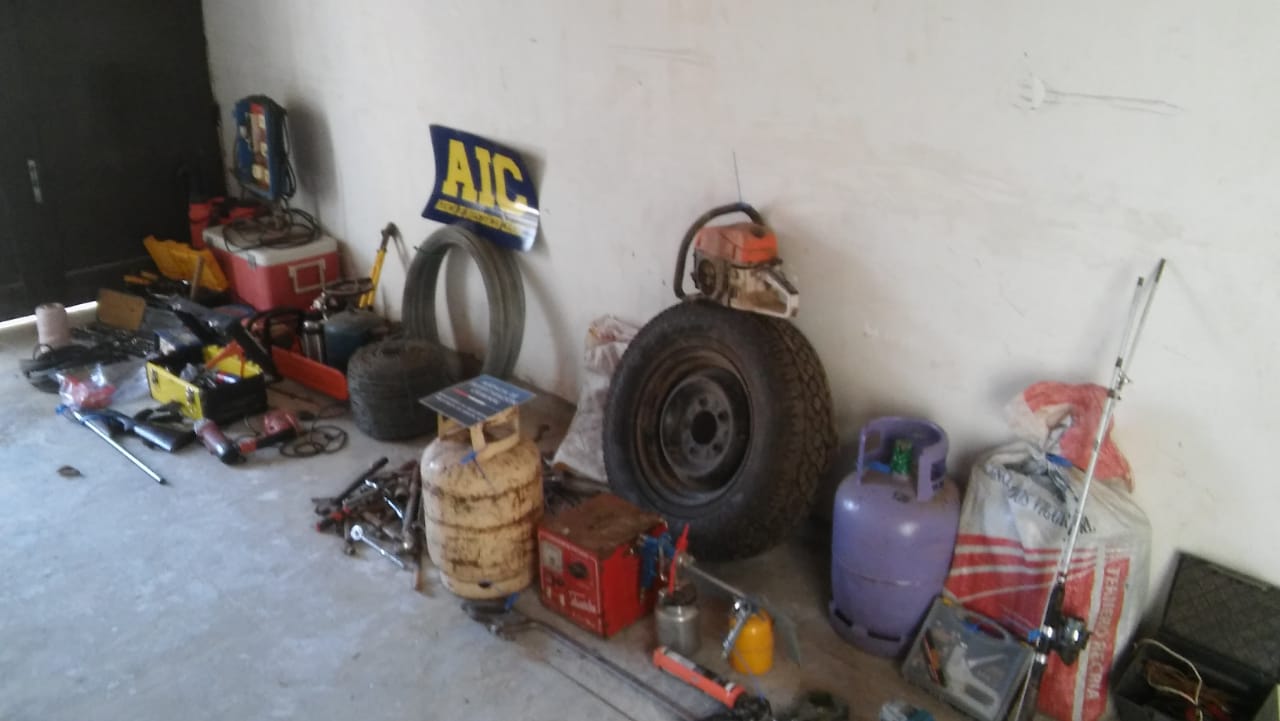 Se allanaron 12 viviendas ubicadas en el predio de B° Los Hornos de la ciudad de Santo Tomé, obteniendo como resultado el secuestro de (3) cajas de herramientas de mano, (3) boyeros eléctricos, (1) conservadora grande, (2) cajas de llave tubo, (2) motosierras, (1) taladro, (2) rollos de alambre, (3) garrafas, (2) pistolas de pintar, (1) cargador de batería, (1) mochila de fumigar.
