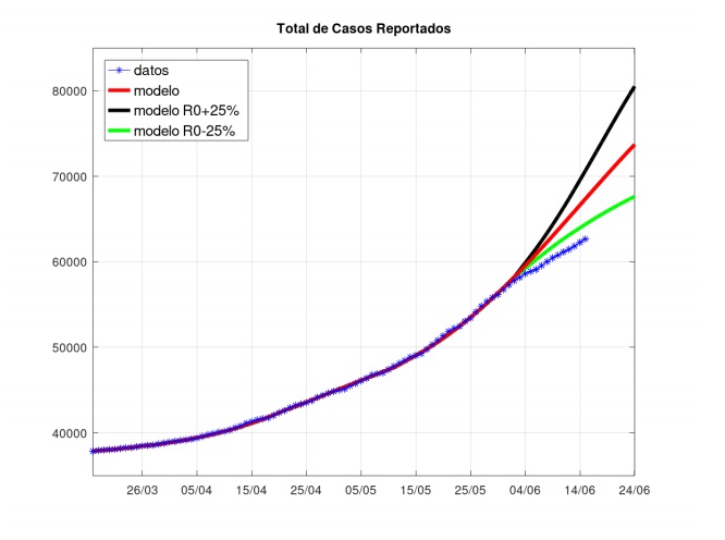 En el gráfico, se puede observar la línea roja que ilustra las previsiones hasta el 24 de junio. La curva negra corresponde a un aumento del 25 % del coeficiente R0 asociado a retornos a actividades sociales en ámbitos de baja aireación. La curva verde, en cambio corresponde a una atenuación del impacto de una manera importante.