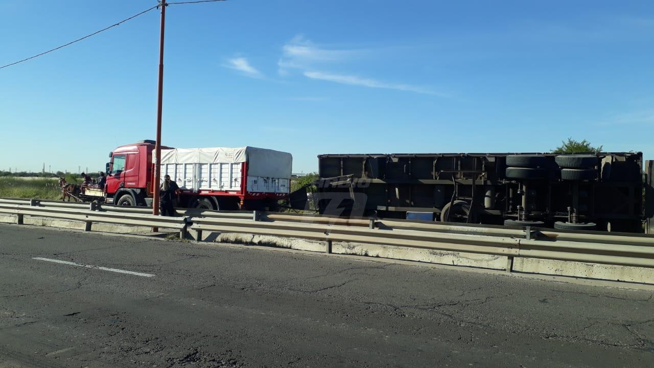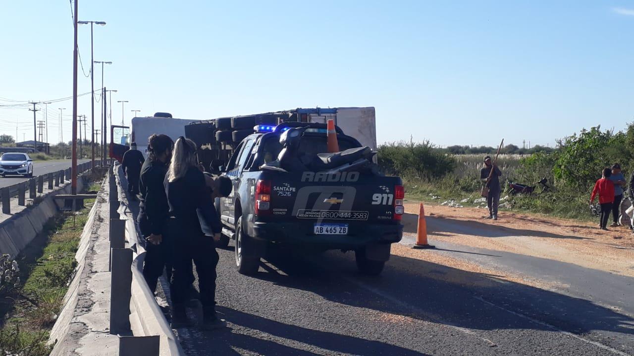 El vehículo de mayor porte hizo una maniobra para evitar colisionar con el birrodado mientras éste lo sobrepasaba, terminando volcado y con parte de la carga de granos dispersa en el asfalto.
