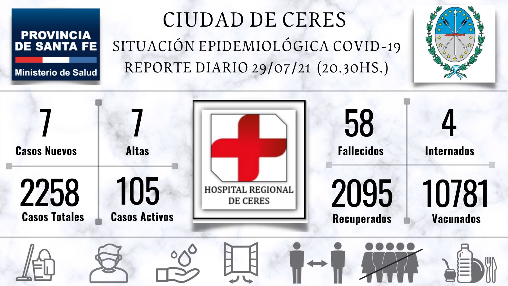 Además se contabilizaron 7 nuevos casos y 7 altas médicas, el total de casos activos sigue siendo elevado en la ciudad, con 105. Los vacunados totales al menos con una dosis son 10781.