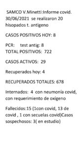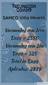Este miércoles, desde el Hospital de Villa Minetti dieron a conocer que ya se llevan aplicadas un total de 2879 dosis contras el Covid-19 en la localidad.