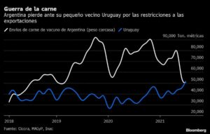 Los límites a las exportaciones de carne de vacuno de Argentina se están dejando sentir con tanta fuerza que los envíos de Uruguay superaron en julio por primera vez en más de tres años a los de su vecino, que es mucho más grande.