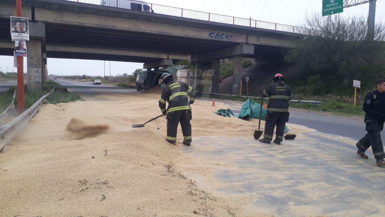 Como consecuencia del accidente los granos quedaron sobre la cinta asfáltica. No se registraron heridos.