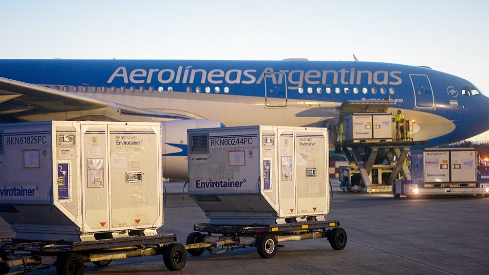 El nuevo cargamento con 936.000 vacunas del laboratorio Pfizer arribó esta mañana al Aeropuerto Internacional de Ezeiza a bordo del vuelo AA931 de American Airlines, al que se sumará el jueves por la tarde un nuevo envío con otras 687.960 dosis de esta firma.