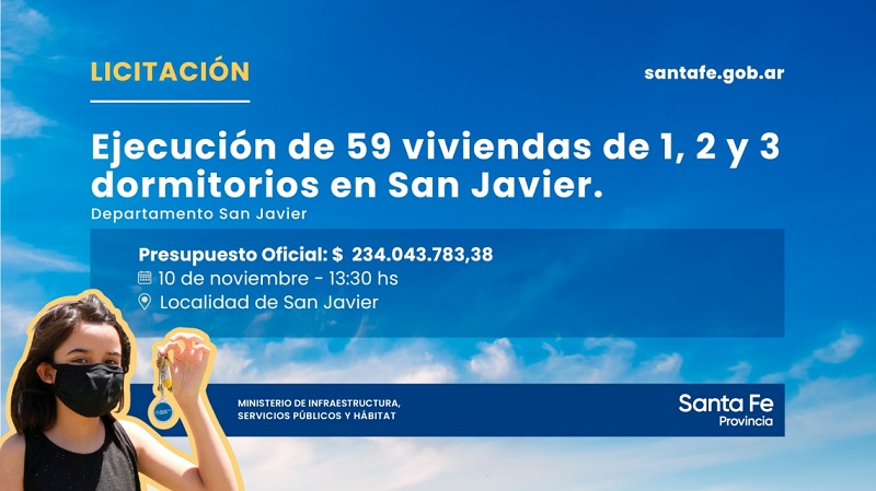 El Ministerio de Infraestructura, Servicios Públicos y Hábitat, a través de la dirección provincial de Vivienda y Urbanismo, licitará el miércoles 10 de noviembre, 59 viviendas en San Javier, obra que cuenta con un presupuesto oficial de $ 234.043.783,38 y un plazo de ejecución de 12 meses. El acto se llevará a cabo, desde las 13:30 horas, en el edificio de la Escuela de Enseñanza Media Nº 242 “General Manuel Belgrano”, Alvear 2240, de esa ciudad.