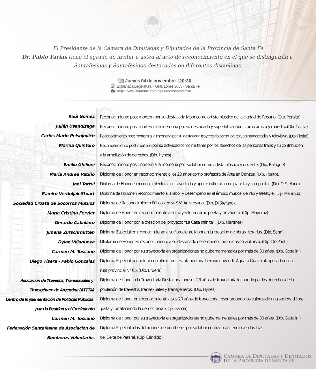 Una serie de actos que tuvo inicio durante la última semana de octubre donde se llevan a cabo reconocimientos múltiples a diferentes personas e instituciones santafesinas que se destacan en alguna disciplina o por algún suceso trascendente que haya protagonizado.