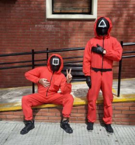 Las dos personas vestidas como la serie El Juego del Calamar estuvieron en el lugar donde votó el candidato a diputado nacional del Frente de Todos en la Ciudad de Buenos Aires Leandro Santor