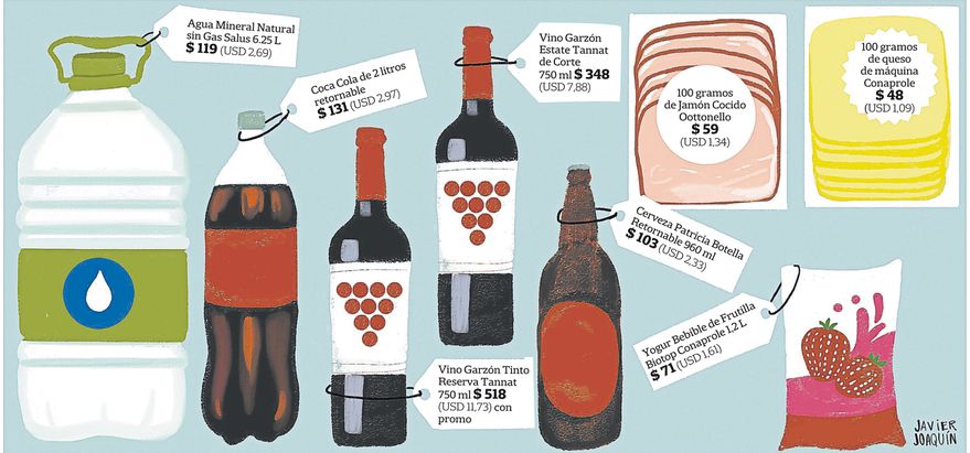 Tienda Inglesa, el supermercado más exclusivo, vende el litro de cerveza a $ 103 (USD 2,33, tomando como valor de cambio 44,16 pesos por dolar), una Coca Cola de dos litros a $ 131 (USD 3) y un kilo de la tradicional yerba Canarias a $ 190 (USD 4,30). El Novillo Alegre, la carnicería de Punta más famosa y de cortes de calidad, vende el kilo de asado común a $ 450 o USD 10,19), pero hay opciones bastante más baratas, y también más caras, como el kilo de matambrito de cerdo a $ 690 (USD 15,63). ¿La bolsa de carbón? $ 160 o USD 3,62.