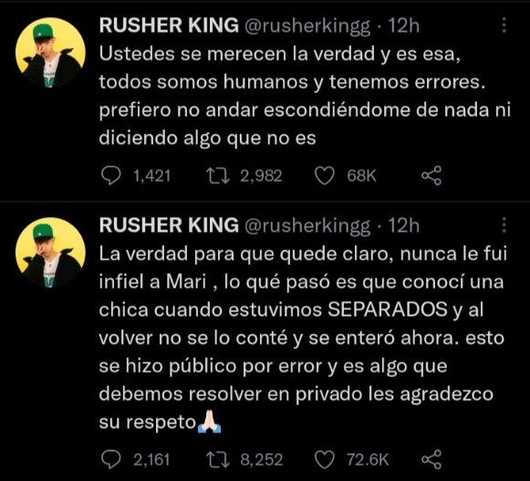 Con algunas horas de diferencia, en un tuit dirigido a sus seguidores, Rusher también respondió a los rumores de una infidelidad de su parte. “La verdad para que quede claro, nunca le fui infiel a Mari, lo qué pasó es que conocí una chica cuando estuvimos SEPARADOS y al volver no se lo conté y se enteró ahora. Esto se hizo público por error y es algo que debemos resolver en privado les agradezco su respeto”, expuso.