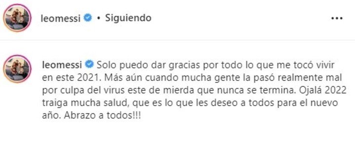 Un Lionel Messi más auténtico que nunca cerró el 2021 con un mensaje fiel a su estilo, poniendo en palabras sus emociones sin buscar diplomacias ni formas. Así, el año que lo tuvo consagrándose como campeón de la Copa América y sufriendo un inesperado cambio de hogar en Europa, obligado a mudarse de Barcelona a París, aprovechó para saludar a sus fanáticos y, de paso, insultar al coronavirus.