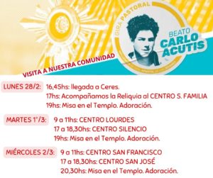 Desde el lunes 28 de Febrero hasta el jueves 03 de Marzo recibiremos la visita de la Reliquia de Carlo Acutis. La muestra recorrerá diferentes Centros Parroquiales y se invita a la comunidad a recibirlo el lunes a las 16:45 en el ingreso a la ciudad.