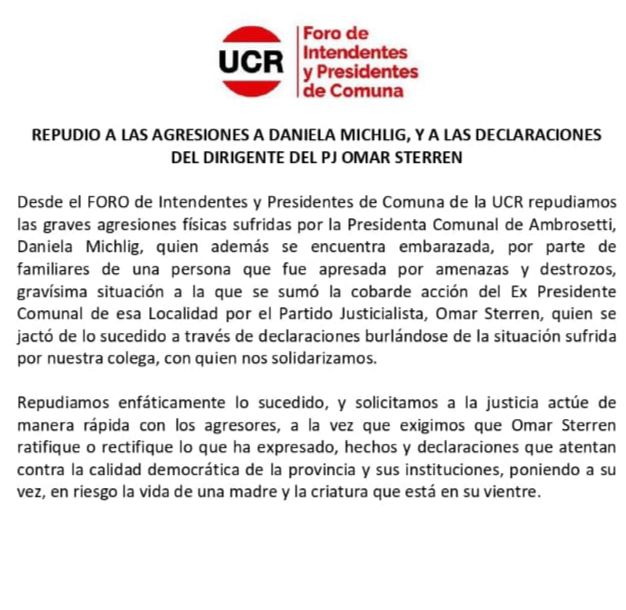 El foro de Intendentes y Presidentes de Comuna de la UCR se solidarizó con Dianela Michlig y expresó su repudio