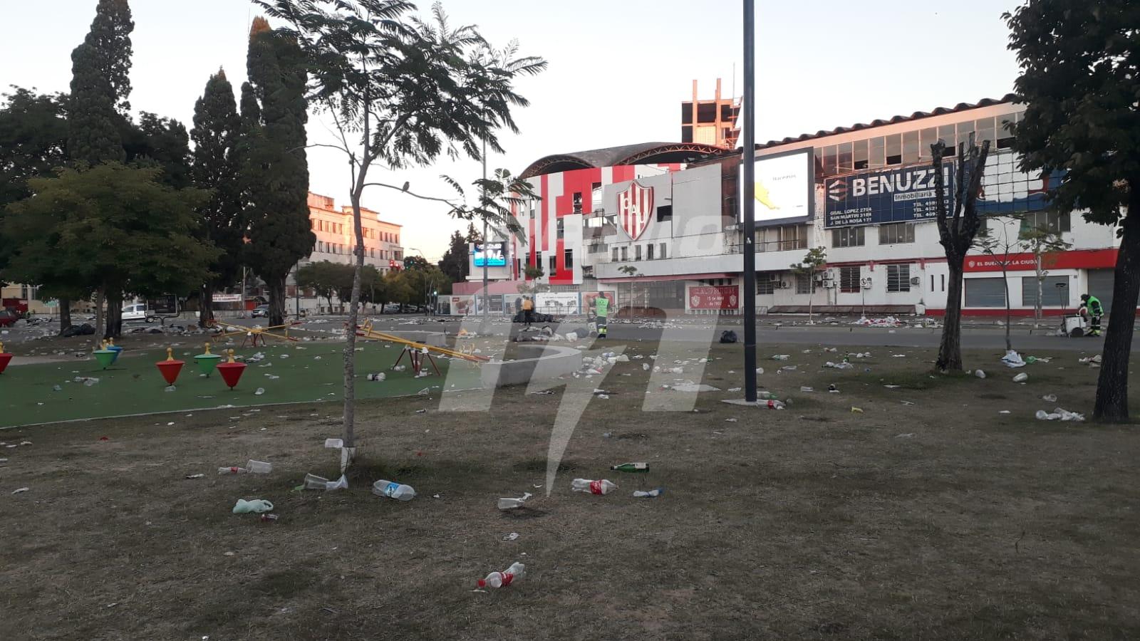 En las primeras horas de la mañana de hoy, se registraron grandes cantidades de botellas y vasos desplegados en las inmediaciones de Avenida López y Planes, casi al límite de Boulevard Pellegrini. Además, se produjeron múltiples cúmulos de basura en la plaza ubicada frente al club tatengue, reportó el móvil de Radio EME.
