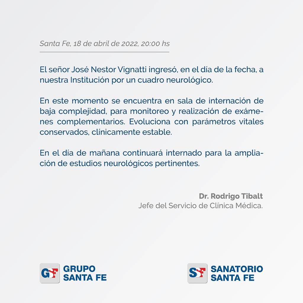 En tanto, el sanatorio privado comunicó que este martes Vignatti “continuará internado para la ampliación de estudios neurológicos pertinentes”.