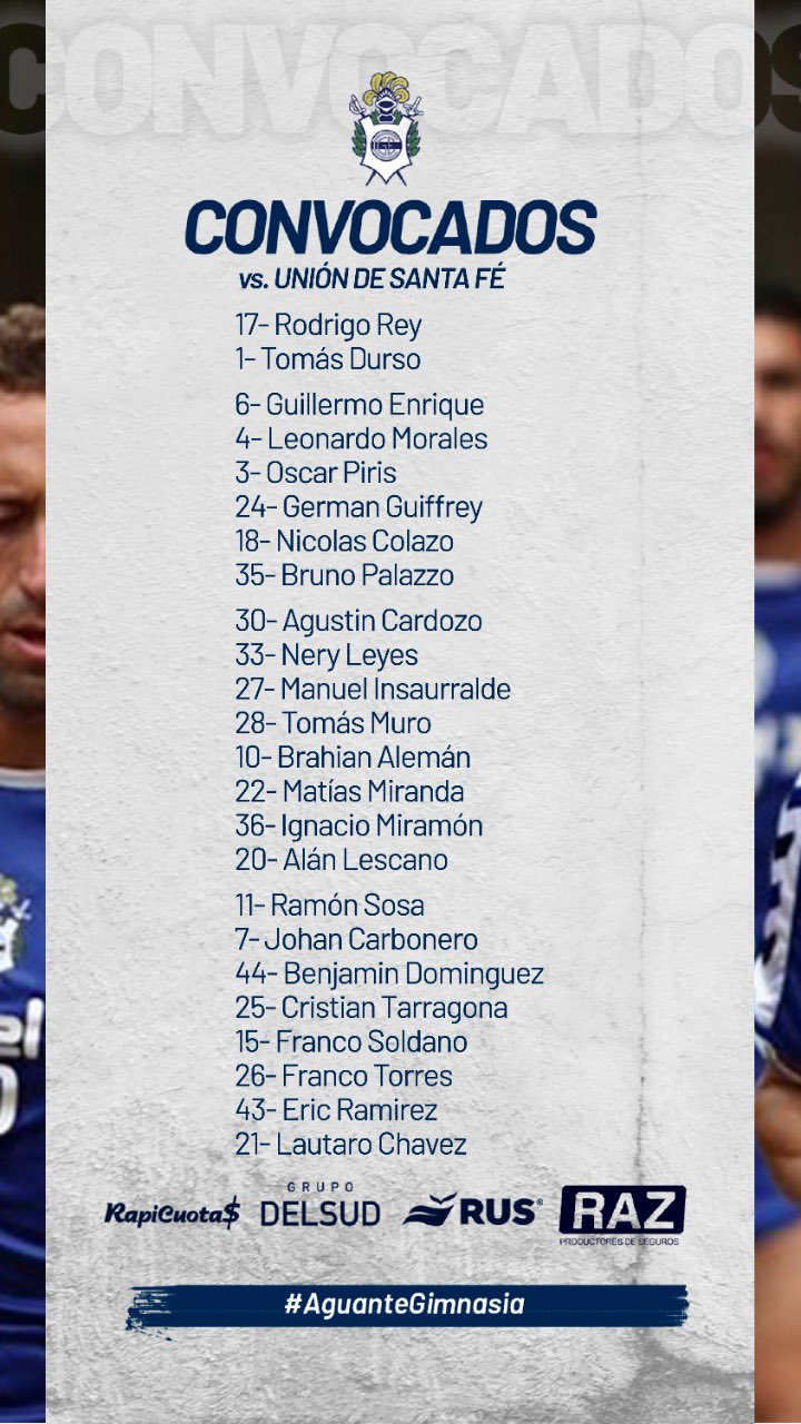 Gimnasia: 17- Rodrigo Rey/ 6- Guillermo Enrique, 4- Leonardo Morales, 3- Oscar Piris y 24- Germán Guiffrey/11- Ramón Sosa, 30- Agustín Cardozo, 10- Brahian Alemán y 7- Johan Carbonero/ 43- Eric Ramírez y 25- Cristian Tarragona. DT: Néstor Gorosito.